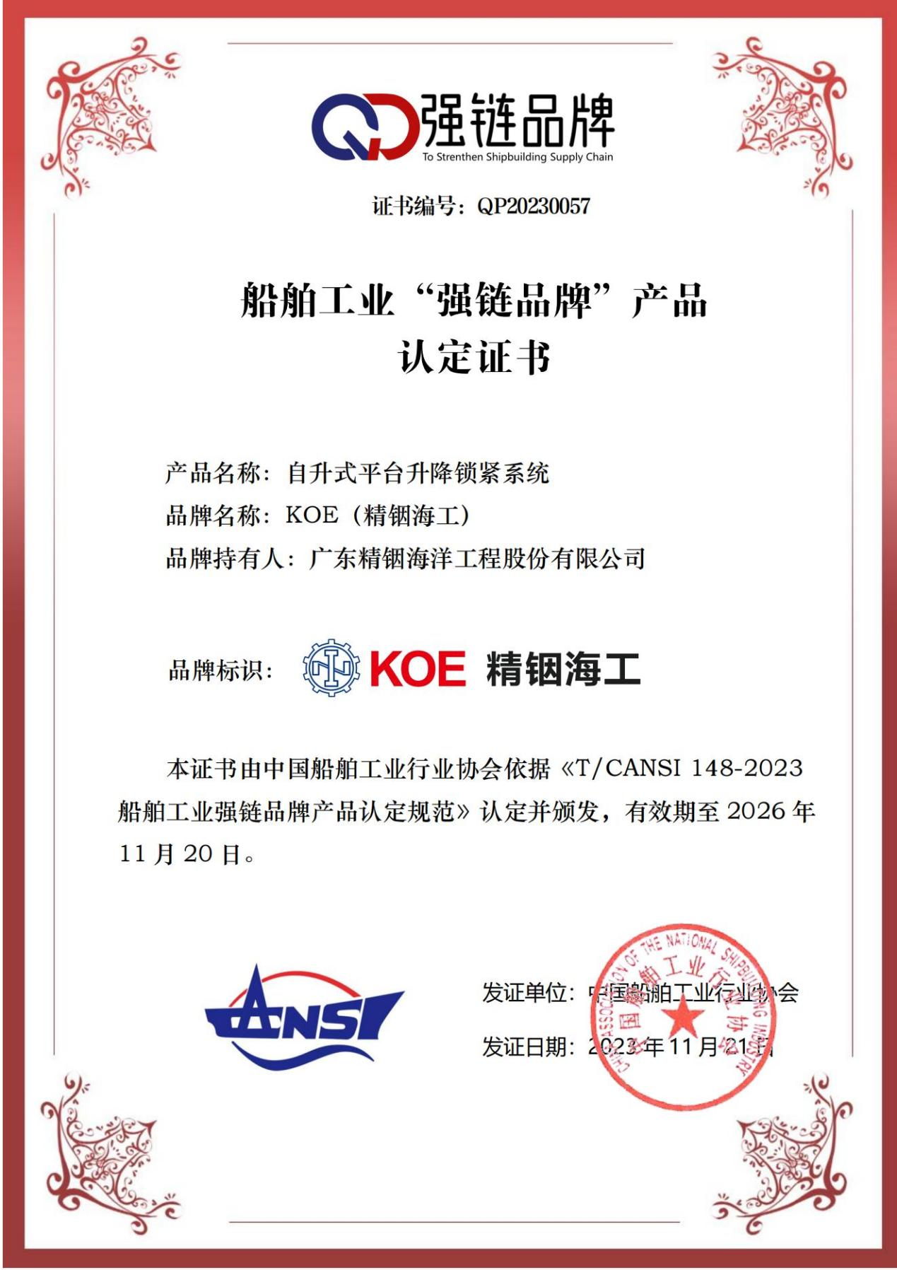經(jīng)中國船舶工業(yè)行業(yè)協(xié)會(huì)的專家評(píng)審,精銦海工的“自升式平臺(tái)升降鎖緊系統(tǒng)”成功入選船舶工業(yè)“強(qiáng)鏈品牌”產(chǎn)品目錄,產(chǎn)品的卓越性能和可靠性再次得到了權(quán)威認(rèn)可,彰顯了精銦海工在船舶工業(yè)領(lǐng)域的競(jìng)爭(zhēng)力和影響力。